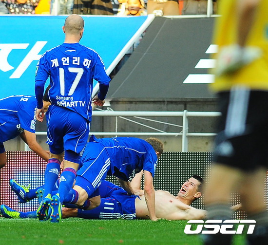 3일 오후 수원 월드컵경기장에서 열린 현대오일뱅크 K리그 2011 수원 삼성과 FC 서울의 27R 경기에서 후반 33분 수원 스테보가 선취 헤딩슛을 성공시킨 후 유니폼을 벗고 기뻐하고 있다.
