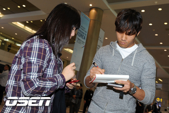 아스널 박주영이 7일 열릴 폴란드와의 친선경기와 11일 월드컵 아시아지역 3차예선 아랍에미리트연합(UAE)과의 경기에 나서기 위해 3일 오후 인천국제공항을 통해 입국했다. 박주영이 여성팬에게 사인을 해주고 있다.
