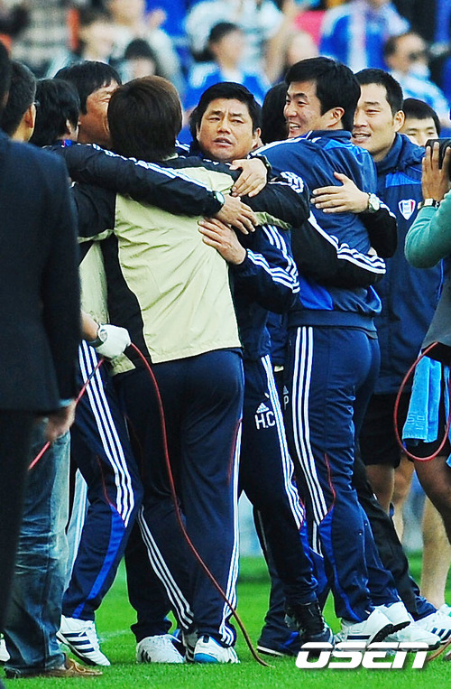 경기를 마치고 수원 윤성효 감독이 코칭스태프 들과 기쁨을 나누고 있다.