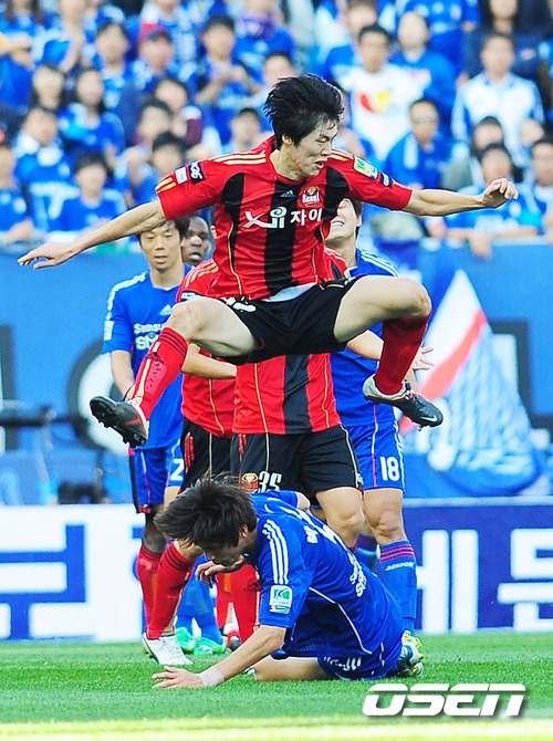 후반 서울 고명진이 수원 박현범을 뛰어넘고 있다.