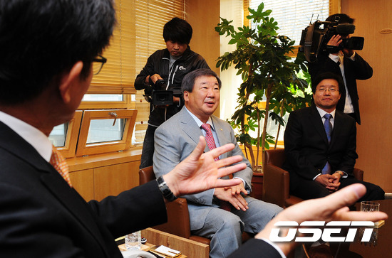 [OSEN=지형준기자] 김문수 경기도지사와 염태영 수원시장이 4일 오후 서울 도곡동 야구회관에서 수원시 프로야구 10구단 유치 추진을 위해 KBO 구본능 총재를 예방, 환담을 나누고 있다.
