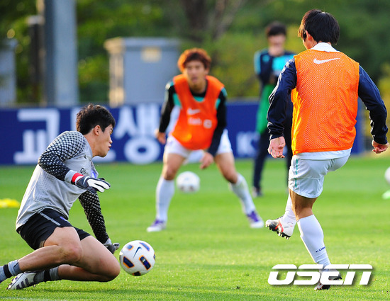 미니게임중 정성룡이 윤빛가람의 슛을 막아내고 있다.
