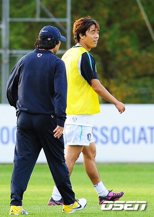 조광래 감독이 훈련중인 박주영에게 다가가 말을 걸고 있다.