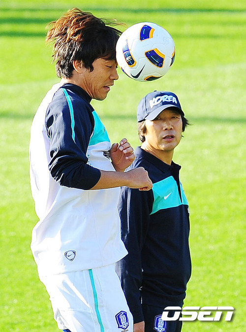 조광래 감독이 박주영의 헤딩훈련을 바라보고 있다.