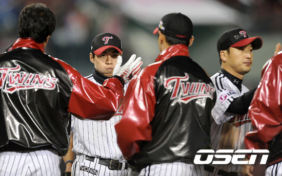 LG는 4일 잠실구장에서 열린 '2011 롯데카드 프로야구' 삼성전에서 선발 외국인투수 레다메스 리즈의 호투와 '작뱅' 이병규의 2타점의 맹타에 힘입어 7-2로 짜릿한 역전승을 이끌어냈다. 경기 후 LG 선수들이 승리의 기쁨을 나누고 있다.