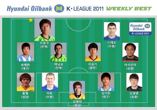 '라이언킹' 이동국(전북)이 프로축구 27라운드 최우수선수(MVP)로 선정됐다. 한국프로축구연맹은 5일 현대오일뱅크 K리그 2011 27라운드 상무와의 홈경기에서 2골1도움으로 맹활약한 이동국을 MVP로 뽑았다. 이동국은 지난 3일 전주월드컵경기장에서 열린 상무와의 홈경기에서 시즌 15번째 도움을 채워 한 시즌 최다 도움 신기록을 세웠다. 또 정규리그 16골로 김정우(성남 일화·15골)를 제치고 득점랭킹 단독 2위로 올라섰고, K리그에서 개인 통산 115골을 터뜨려 통산 최다골(116골)을 기록한 우성용(은퇴)에 한 골 차로 다가섰다. 서울과의 라이벌전에서 결승골을 넣어 수원의 1-0 승리를 이끈 스테보가 '위클리 베스트 11' 공격수의 남은 한 자리를 차지했다. 미드필더 부문에는 송제헌(대구), 에닝요(전북), 이승기(광주), 아사모아(포항)이 뽑혔다. 그리고 수비수로는 홍철(성남), 마토(수원), 김기희(대구), 신광훈(포항)이 이름을 올렸고 골키퍼 자리는 김병지(경남)가 채웠다. 이밖에 전북이 베스트 팀으로 4만4537명이 몰린 수원-서울의 라이벌전은 27라운드 베스트 매치로 각각 선정됐다. 10bird@osen.co.kr