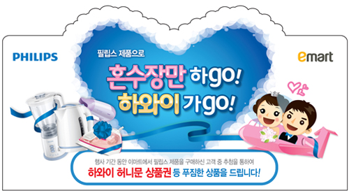 필립스전자는 ‘혼수 장만하고, 하와이 가고’ 행사를 이마트에서 10월 6일부터 23일까지 진행한다. 이 행사는 혼수 시즌을 맞아 기획된 것으로 혼수 장만을 계획하고 있던 예비 부부들은 전국 120여개 이마트 가전 매장에서 면도기, 드라이어 등의 이미용가전, 블렌더, 토스터 등의 주방가전, 음향가전 등 필립스에서 취급하는 다양한 카테고리의 제품을 최대 40% 할인된 가격에 구매할 수 있다. 또한 필립스에서는 제품을 구매한 모든 고객에게 경품 행사에 응모할 수 있는 기회를 제공한다. 게다가 7만원 이상 구매한 고객에게는 에코백이 무료로 증정된다. 경품행사에 당첨된 1명은 ‘하와이’ 허니문 상품권을 받을 수 있다. 이외에도 필립스 세코 전자동 에스프레소 머신 10개, 필립스 에르고핏 청소기 20개, 신세계 5만원 상품권 100장이 사은품으로 준비되어있다. 필립스 영업 총괄 이충렬 전무는 “최근 20, 30대의 라이프스타일 변화로 에스프레소 머신, 도킹 오디오, 컴팩트 청소기 등이 주목을 받는 등 혼수 필수 소형 가전 품목에도 변화가 생겼다”며 “이번 기회를 통해 라이프스타일을 살릴 수 있는 실속 있는 혼수 준비 기회가 되기를 바란다”고 밝혔다. insun@osen.co.kr