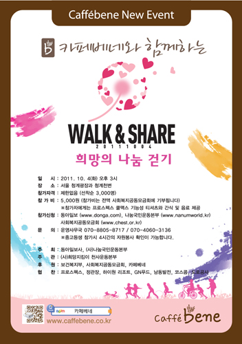 국내 대표커피전문점 (주)카페베네(대표이사 김선권)가 지난 4일 서울청계광장과 청계천변에서 펼쳐진 ‘희망의 나눔 걷기’ 행사를 후원했다. ‘노블레스 오블리주’ 에서 한 걸음 나아가 보통 사람들의 작은 나눔 운동을 가리키는 ‘시티즌 오블리주’ 정신을 확산시키고 독려하기 위해 펼쳐진 이번 행사는 맑은 가을 날, 청계천 물길을 따라 걸으며 ‘나눔과 사랑’ 의 정서를 되살려보고자 마련된 자리였다. ‘희망의 나눔 걷기-Walk&Share'는 이날 오후 3시 반 청계광장을 출발해 오간수교까지 5.4km를 돌아오는 방식으로 펼쳐졌고, 이밖에 기부금 전달식, 1004개 풍선 날리기 등의 식전 행사와 시각장애우 예술단 ‘한빛예술단(중창단)’, 재즈피아니스트 서우빈 등의 공연이 열렸다. 걷기 행사 후 저녁 6시부터는 청계광장 특설무대에서 가수 김장훈, 쥬얼리 등의 초대가수들이 재능기부로 출연하는 ‘나눔콘서트’가 진행됐다. 김선권 대표이사는 “청계천변을 걸으며 카페베네가 사회참여적 기업으로 성장하는데 지속적으로 힘쓸 것을 다짐하는 시간이 됐다”며, “나아가 국제 사회에도 기여할 수 있는 글로벌 기업을 이루는 것이 카페베네의 꿈이자 나의 꿈이다”라고 전했다. 한편 오는 12월 뉴욕 맨해튼-해외1호점 개장을 앞둔 ‘글로벌브랜드-카페베네’는 홈페이지(caffebene.co.kr)와 트위터(@caffebenehq)를 통해 만날 수 있다. silver11@osen.co.kr