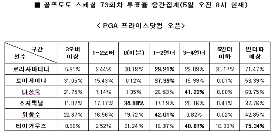 [골프토토] PGA 프라이스닷컴 오픈 및 LPGA 하나은행 챔피언십 1라운드 대상 스페셜 73회차, 74회차 중간집계 결과…6일 발매 마감 국내 골프팬들은 PGA 프라이스닷컴 오픈에서 '골프 황제' 타이거 우즈의 언더파 가능성을 가장 높게 점치고 있는 것으로 나타났다. 국민체육진흥공단(www.kspo.or.kr)이 발행하는 체육진흥투표권 수탁사업자인 스포츠토토 공식 온라인 발매 사이트인 베트맨(www.betman.co.kr)은 오는 6일 미국 캘리포니아 코드벌 골프장에서 열리는 PGA 가을 시리즈 두 번째 대회인 'PGA 프라이스닷컴 오픈' 1라운드를 대상으로 한 골프토토 스페셜 73회차에서 전체 참가자의 75.34%가 타이거 우즈의 언더파 활약을 예상했다고 밝혔다. 타이거 우즈에 이어 로리사바티니(71.47%), 나상욱(69.75%), 토미게이니(53.39%)의 1라운드 언더파 활약이 예상된 반면, 위창수(42.85%)와 조지맥닐(37.76%)은 언더파 예상이 비교적 낮게 나타났다. 지정 선수별 1라운드 예상 스코어에서는 이달 3일 생애 첫 PGA우승을 거둔 나상욱(41.22%)과 타이거우즈(40.07%)가 3~4언더로 가장 좋은 성적을 기록할 것으로 집계됐고, 위창수(42.01%), 토미게이니(37.39%), 로리사바티니(29.21%)는 1~2언더가 가장 높게 예상됐다. 반면 조지맥닐(34.00%)은 0(이븐)이 가장 높게 집계돼 1라운드 부진이 예상됐다. LPGA 하나은행 챔피언십 1라운드…야니 챙 언더파 활약 75.40% 한편, 오는 7일(금) 인천 스카이72 골프클럽 오션코스에서 펼쳐지는 'LPGA 하나은행 챔피언십' 1라운드를 대상으로 한 골프토토 스페셜 74회차에서는 전체 참가자의 75.40%가 야니 챙의 언더파 활약을 예상했다. 나머지 대상선수들인 크리스티커(43.97%), 수잔페테르손(39.13%), 캐리웹(38.84%), 모건프레셀(36.34%), 브리타니린시컴(26.45%)은 언더파 예상이 상대적으로 낮게 나타났다. 1라운드 예상 스코어에서는 야니 챙(38.89%)이 3~4언더로 가장 우수한 성적이 예상됐고, 크리스티 커(40.66%), 수잔페테르손(25.96%)이 1~2언더로 뒤를 이었다. 반면 모건프레셀(38.41%)은 0(이븐) 기록 예상이 가장 높게 나타났고, 캐리웹(43.32%), 브리타니린시컴(31.17%)은 1~2오버가 가장 높게 집계돼 1라운드 부진이 예상됐다. 이번 골프토토 스페셜 73회차와 74회차는 각각 6일 오후 9시 50분, 오후 10시에 발매가 마감되며, 1라운드가 모두 종료된 후에 결과가 공식 발표된다. '즐거운 스포츠, 즐거운 토토'(http://www.betman.co.kr)