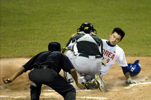 29년만에 우승에 도전하는 야구월드컵 대표팀이 호주를 누르고 기분좋은 2연승을 달렸다. 천보성(한양대) 감독이 이끄는 야구대표팀은 5일(한국시간) 파나마 리코 세데뇨 야구장에서 열린 제39회 야구월드컵 예선 2라운드 3차전에서 선발 오현택의 6이닝 10탈삼진 무실점 완벽투와 모창민의 쐐기포를 앞세워 호주에 8-0 완승을 거뒀다. 1회말 한국은 1사 후 최주환의 내야안타에 이어 모창민의 좌전 2루타 때 최주환이 홈으로 쇄도하다 아웃됐다. 김재환이 좌익수 플라이로 아웃되며 득점에 실패했다. 2회 삼자범퇴로 물러난 한국은 3회 한동민의 볼넷에 이은 고종욱의 좌전안타로 1사 1,2루 찬스를 맞았다. 최주환이 1타점 좌전 적시 2루타를 때려 한동민을 홈으로 불러들이며 선취점을 뽑아냈다. 모창민이 유격수 플라이로 아웃됐지만 고종욱이 김재환의 타석에서 투수 폭투 때 추가점을 올렸다. 김재환의 볼넷으로 계속 이어진 2사 2,3루 기회에서 이지영이 2타점 좌전 적시타를 때려내며 한국은 3회말 4-0 리드를 잡았다. 선발로 나선 오현택(상무)은 예리한 커브로 4회까지 7개의 삼진을 잡으며 퍼펙트 경기를 펼치다 5회초 선두타자 웰츠에게 이날 첫 안타를 내줬다. 오현택은 삼진 2개를 묶어 세 타자를 범타 처리하며 실점 없이 이닝을 마쳤다. 한국은 바로 5회말 1사 후 모창민이 승리에 쐐기를 박는 큼지막한 좌월 솔로포를 터뜨렸다. 야구대표팀의 이번 대회 첫 홈런이었다. 오현택이 마운드를 내려간 뒤 한국은 7회 1사 후 케넬리와 하먼의 연속 안타로 1사 1,2루 위기를 맞았다. 그러나 구원투수 문승원이 후속타자들을 범타처리하며 실점 없이 위기를 넘겼다. 좌익수 박해민의 뛰어나오면서 캐치하는 호수비가 빛났다. 한국은 8회말 김재환과 이재영의 연속 안타, 최재훈의 희생번트로 1사 2,3루 기회를 만들었다. 박해민의 2루수 앞 내야안타로 김재환이 홈을 밟아 추가점을 뽑았다. 이어 한동민의 2타점 중전 적시타로 8-0까지 달아났다. 한국은 9회 2사에서 임현준(삼성)을 투입해 8-0 영봉승을 마무리했다. 호주는 이번 대회에서 3경기 27이닝 무득점 굴욕을 당했다. 야구대표팀은 7일 산티아고 오마르 토리호스에서 아마야구 강국 쿠바와 예선 2라운드 4차전을 치른다. autumnbb@osen.co.kr IBAF 홈페이지.