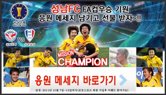 이탈리아 정통 스포츠 브랜드 로또스포츠에서 2011 하나은행 FA컵 결승전에 진출한 성남 일화 선수들에게 응원의 메시지를 남기는 이벤트를 진행한다. 로또스포츠는 15일 탄천종합운동장서 열리는 성남과 수원 삼성의 FA컵 결승전에서 성남의 승리를 기원하는 의미로 이벤트를 진행한다. 로또스포츠는 첫 골의 주인공의 친필 싸인이 담긴 축구화 5켤레를 상품으로 준비했다. 이벤트는 오는 7일부터 13일까지 진행되며, 로또스포츠 쇼핑몰(www.lottosportshop.co.kr)에 성남을 응원하는 메시지를 남기면 된다. ball@osen.co.kr