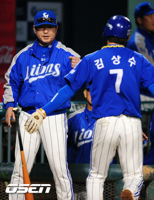 5일 오후 잠실구장에서 열린 '2011 롯데카드 프로야구' LG 트윈스와 삼성 라이온즈의 경기, 1회초 1사 1,3루에서 삼성 최형우의 희생플라이에 홈을 밟은 김상수가 류중일 감독과 하이파이브를 하고 있다. 이날 경기는 LG 김성현과 삼성 저스틴 저마노과 선발 맞대결을 펼친다. 김성현은 지난 7월 31일 넥센에서 LG로 트레이드 후 8차례 선발 등판해 1승4패에 머물고 있다. 퀄리티스타트(6이닝 이상 투구 3자책 이하)도 3차례에 불과하다. 직구 구위는 뛰어나지만 제구력이 좋지 않으면서 어려움을 겪고 있다. 그러나 내년 시즌 선발 후보인 만큼 마무리를 잘 짓는 것이 목표이다. 저마노는 시즌 도중 삼성 유니폼을 입고 7경기에 등판해 5승1패 평균자책점 2.75를 마크하고 있다. 안정된 제구력과 공 끝의 움직임이 좋아 타자들이 좀처럼 쉽게 공략하지 못하고 있다. 여기에 메이저리그 경력 덕분인지 위기 상황을 벗어날 수 있는 능력도 뛰어나다. 한국시리즈 우승을 목표로 하는 삼성의 필승카드다. /jpnews@osen.co.kr