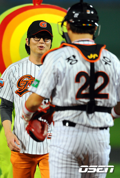 5일 오후 부산 사직구장에서 열린 '2011 롯데카드 프로야구' 롯데 자이언츠와 한화 이글스의 경기 전 가수 루시드폴이 시구를 마치고 장성우에게 시구공을 받고 있다. 플레이오프 직행을 확정한 롯데에 비해 한화는 LG,두산과 함께 5위 자리 다툼으로 물러설 수 없는 입장이다. 이날 경기에서 롯데는 사도스키를, 한화는 양훈을 선발투수로 내세운다./ soul1014@osen.co.kr