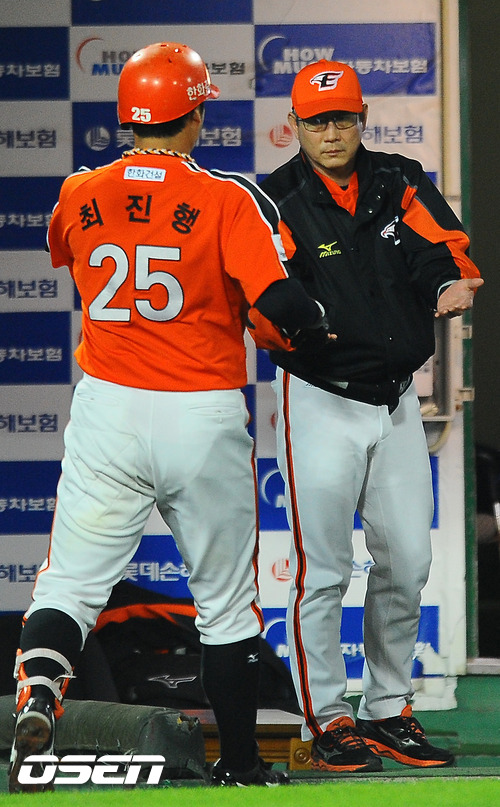 5일 오후 부산 사직구장에서 열린 '2011 롯데카드 프로야구' 롯데 자이언츠와 한화 이글스의 경기 3회초 2사 한화 최진행이 솔로홈런을 날리고 한대화 감독 하이파이브를 하고 있다. 플레이오프 직행을 확정한 롯데에 비해 한화는 LG,두산과 함께 5위 자리 다툼으로 물러설 수 없는 입장이다. 이날 경기에서 롯데는 사도스키를, 한화는 양훈을 선발투수로 내세운다./ soul1014@osen.co.kr