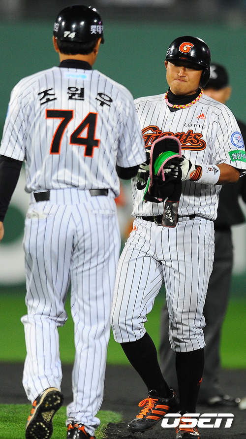 5일 오후 부산 사직구장에서 열린 '2011 롯데카드 프로야구' 롯데 자이언츠와 한화 이글스의 경기 8회말 1사 만루 상황 롯데 손용석이 역전 3타점 적시타를 날린후 조원우 코치와 하이파이브를 하고 있다. 플레이오프 직행을 확정한 롯데에 비해 한화는 LG,두산과 함께 5위 자리 다툼으로 물러설 수 없는 입장이다. 이날 경기에서 롯데는 사도스키를, 한화는 양훈을 선발투수로 내세운다./ soul1014@osen.co.kr