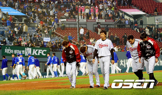 LG와 삼성은 5일 잠실구장에서 열린 '2011 롯데카드 프로야구' 시즌 18번째 맞대결에서 2-2 동점으로 승부를 가리지 못했다. 이 때문에 삼성은 78승4무5패를 기록하며 1위를 지켰다. 반면 LG는 59승2무71패를 기록하며 한화와 함께 공동 6위로 뛰어올랐다. 삼성과 LG 선수들이 팬들에게 인사를 하고 더그아웃으로 향하고 있다. /jpnews@osen.co.kr