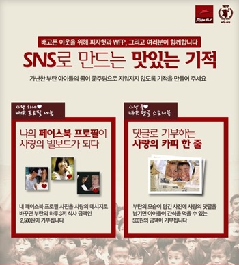 -세계기아해방 캠페인 일환, 기아 돕기 성금 마련 프로그램 진행 -이벤트 참여자 수 만큼의 기금을 기아 해방을 위한 기금으로 추가 기부 재미와 즐거움을 주는 한국 피자헛(www.pizzahut.co.kr, 대표 이승일)이 페이스북을 통해 부탄의 굶주린 아이들을 돕기 위한 기금을 모금하는 'SNS로 만드는 맛있는 기적' 참여 이벤트를 10월 31일까지 진행한다. 이번 'SNS로 만드는 맛있는 기적' 이벤트는 피자헛이 유엔 산하 세계식량계획(WFP)과 함께 전개하는 ‘2011 세계기아해방’ 캠페인의 일환으로, 이벤트 참여자 수만큼 피자헛이 기아 해방 기금을 추가로 조성해 부탄의 아이들을 위해 기부할 예정이다. 피자헛 공식 페이스북(www.facebook.com/enjoypizzahut)에서 진행되는 이번 이벤트는 피자헛 페이스북 팬(fan)이라면 누구나 참여 가능하다. ‘WHR 프로필 나눔’ 이벤트에 참여해 일주일 동안 자신의 페이스북 프로필을 세계기아해방 캠페인 프로필로 바꾸면, 참가자 1인당 부탄 어린이의 하루 세끼 식사 금액인 2,500원이 기아 돕기 성금으로 전달된다. 이와 함께 부탄 어린이들의 사진을 보고 응원의 댓글을 남기는 ‘WHR 댓글 스토리북’ 이벤트에 참여하면, 댓글 1개 마다 부탄 어린이들의 간식 비용인 500원의 금액이 기부금으로 적립된다. 한편, 세계기아해방(WHR, World Hunger Relief) 캠페인은 피자헛의 모기업인 얌 브랜즈(YUM! Brands)와 유엔 산하 글로벌 식량 구호 단체인 세계식량계획(WFP)이 함께 2007년부터 매년 진행하고 있는 기아 돕기 자선 캠페인이다. 100c@osen.co.kr