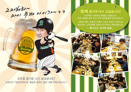 베니건스(㈜바른손)가 지난 5일 하루 동안 아무런 조건 없이 매장을 방문하는 모든 고객에게 무료 맥주를 무제한으로 제공하는 이벤트를 열었다. 지난 7월, 베니건스는 프로야구선수협회와 업무협약식을 체결하며 프로야구 마케팅의 일환으로 ‘이대호 도루 성공 시, 무한 맥주 공짜’ 이벤트를 기획했다. 따라서 지난 4일 이대호 선수가 한화와의 경기에서 시즌 2번째로 도루를 성공시켜 무한 맥주 축제가 진행된 것이다. 이대호 선수가 도루에 성공한 직후인 4일 저녁 8시부터 다음날 5일까지 각종 포털 검색어 1위와 더불어 트위터, 페이스북 유저 등 네티즌 사이에서 화제를 모았던 베니건스의 무제한 무료 맥주 이벤트를 숫자로 풀어보았다. ▲8,000,000CC 이날 평소 베니건스 맥주 일 소비량 533,333CC에서 15배가 넘는 약 8,000,000CC를 소비했다. ▲200,000명 한국인 연평균 기준 맥주 소비량은 약 40리터.(이코노미스트 출처) 이날 약 8,000,000CC를 소비해 한국인 20만 명이 평균적으로 마시는 수치를 기록했다. ▲25,000잔 330CC의 잔을 사용하고 있는 베니건스는 이 날 총 25,000잔이 제공됐다. ▲70,000,000원 현재 베니건스에서 330cc를 2,800원에 판매하고 있다. 이 날 무료로 제공된 맥주를 매출로 환산하면 총 7000만 원으로 계산된다.(이는 월평균 300만원 임금의 도시근로자 기준으로 2년치 연봉에 해당된다) 한편 베니건스는 이날 갑자기 인파가 몰려 많은 시간을 웨이팅하거나 입장하지 못한 고객들에게는 오는 31일까지 동일한 조건으로 사용할 수 있는 맥주 무료 이용 쿠폰을 제공하기도 했다. silver11@osen.co.kr