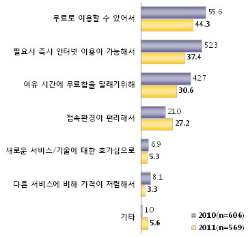 - 와이파이 사용량 ↑, 휴대폰 무선인터넷 사용량 ↓ - 직장에서는 남성 • 커피전문점에서는 여성 사용량 많아 최근 화두로 떠오른 4G 서비스가 이동통신서비스에 어떤 변화를 가져올지 귀추가 주목되고 있다. 기존 3G 서비스는 자연스럽게 4G로 대체되겠지만, 와이파이(WiFi, 무선랜)는 어떻게 되는 걸까? 와이파이는 어느 정도 한계를 갖고 있다. ‘공짜’로 이용이 가능하지만, 이동하면서 사용할 수 없고 연결이 되지 않는 지점이 많다는 것이 큰 불편요소다. 게다가 데이터무제한 요금제 이용자의 경우 굳이 3G에서 와이파이로 전환하여 사용하는 번거로움을 감수할 필요가 없었다. 그러나 4G의 등장은 이런 이용 패턴에 변화를 가져올 가능성이 크다. 이동통신사들이 4G LTE에서는 무제한 데이터 요금제를 폐지할 의향을 보이고 있기 때문이다. 시장조사전문기관 트렌드모니터(trendmonitor.co.kr)가 기획하고 이지서베이(ezsurvey.co.kr)가 진행한 와이파이 사용 실태를 보면 와이파이의 미래에 대해 시사하는 바가 크다. 이번 조사는 디지털기기 보유자 성인남녀 1,000명을 대상으로 설문조사 형식으로 이뤄졌다. 조사 결과, 와이파이와 휴대폰 무선인터넷의 이용경험은 각각 67.8%와 67.4%로 비슷한 수준인 것으로 나타났다. 다만 와이파이 사용은 2010년 65%에서 소폭 상승한 데 반해, 휴대폰 무선인터넷은 71.3%에서 4% 포인트 가량 줄어든 결과를 보였다. 가장 많이 와이파이를 접속하는 단말기는 스마트폰(PDA폰 포함, 79.4%)이었다. 작년 같은 조사(46.6%)보다 30%이상 늘어난 것으로, 스마트폰 대중화와 연관 지어 볼 수 있다. 반면 노트북(60.3%)의 와이파이 접속은 작년(85.4%)에 비해 상당히 줄어들어, 스마트폰이 노트북의 영역을 어느 정도 잠식했음을 짐작하게 한다. 무선랜을 가장 자주 이용하는 장소는 가정(83%, 중복응답)이었으며, 직장(49.1%)과 커피전문점(36.7%)에서의 사용이 그 다음으로 많았다. 다만 직장 내 와이파이 사용은 여성(34.5%)보다 남성(62.1%)이 훨씬 많았고, 커피전문점에서는 여성(41.4%)이 남성(32.6%)보다 와이파이를 더 많이 사용하는 특징을 보였다. 또한 20대(47.1%)의 커피전문점 내 사용이 다른 연령대보다 두드러졌다. 설문에 참여한 패널(panel.co.kr)들은 와이파이 서비스 이용 시 불편한 점으로 인터넷 접속의 불안정(58.5%, 중복응답)과 느린 인터넷 접속 속도(54.1%), 이용 장소 제약(51.7%)을 꼽았다. 작년 같은 조사에서 이용장소의 제약(61.1%), 인터넷 접속 불안정(51.7%), 느린 인터넷 접속 속도(43.2%) 순서로 결과가 나온 것과는 다소 변화를 보인 것이다. 이용장소의 제약에 대한 불만이 감소한 것은 각 통신사에서 최근 와이파이 존을 많이 늘리고 있는 데서 그 이유를 찾을 수 있다. 100c@osen.co.kr