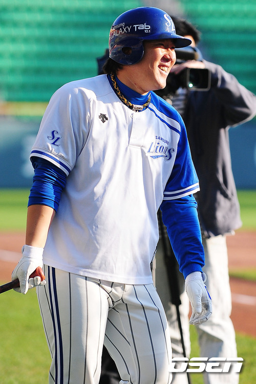 6일 오후 잠실구장에서 열린 '2011 롯데카드 프로야구' LG 트윈스와 삼성 라이온즈의 정규 시즌 마지막 경기에 앞서 타격연습때 삼성 최형우가 환하게 미소짓고 있다. 삼성 오승환은 아시아 신기록 48세이브에 도전중이다. 오승환이 48세이브로 아시아기록을 수립한다면 투수 4관왕(다승`탈삼진`평균자책점`승률)에 오른 윤석민(KIA)과 타격 3관왕(홈런`타점`장타율)이 유력한 팀 동료 최형우와의 MVP 경쟁서 유리한 고지를 차지할 수 있다. 한편 이 날 LG 박종훈 감독은 성적 부진에 대한 책임을 지고 자진 사퇴를 결정했다. / rumi@osen.co.kr