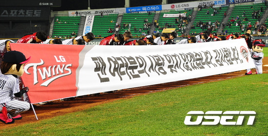 6일 오후 잠실구장에서 열린 '2011 롯데카드 프로야구' LG 트윈스와 삼성 라이온즈의 정규 시즌 마지막 경기에서 LG는 경기 전 자진 사퇴를 발표한 박종훈 감독의 마지막 경기를 승리로 보답하지 못했다. 이 날 경기에서 삼성은 선발 장원삼의 호투와 4번타자 최형우의 3안타 2타점 덕분에 8-3으로 완승을 거뒀다. 경기를 마치고 LG 선수들이 팬들에게 인사를 하고 있다. 승리를 거둔 삼성은 79승4무50패로 정규리그 1위가 됐다. 덕분에 한국시리즈에 직행해 롯데와 준플레이오프 승자의 대결을 여유있게 지켜보게 됐다. 반면 LG는 59승2무72패가 되면서 한화와 함께 공동6위로 시즌을 마감했다. 무엇보다 LG는 경기 전 박종훈 감독이 지난 2년동안 포스트시즌 진출에 실패한 책임을 지고 사퇴를 밝혀 큰 충격에 빠졌다. 이 때문에 선수단은 경기 전 미팅을 통해 "오늘은 꼭 이겨 감독님께 마지막으로 승리를 안겨드리자"고 결의했다. 그러나 1위 삼성이 최선을 다하면서 LG 선수들은 약속을 지키지 못했다. / rumi@osen.co.kr