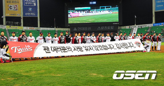 6일 오후 잠실구장에서 열린 '2011 롯데카드 프로야구' LG 트윈스와 삼성 라이온즈의 정규 시즌 마지막 경기에서 LG는 경기 전 자진 사퇴를 발표한 박종훈 감독의 마지막 경기를 승리로 보답하지 못했다. 이 날 경기에서 삼성은 선발 장원삼의 호투와 4번타자 최형우의 3안타 2타점 덕분에 8-3으로 완승을 거뒀다. 경기를 마치고 LG 선수들이 플래카드로 인사를 하고 있다. 승리를 거둔 삼성은 79승4무50패로 정규리그 1위가 됐다. 덕분에 한국시리즈에 직행해 롯데와 준플레이오프 승자의 대결을 여유있게 지켜보게 됐다. 반면 LG는 59승2무72패가 되면서 한화와 함께 공동6위로 시즌을 마감했다. 무엇보다 LG는 경기 전 박종훈 감독이 지난 2년동안 포스트시즌 진출에 실패한 책임을 지고 사퇴를 밝혀 큰 충격에 빠졌다. 이 때문에 선수단은 경기 전 미팅을 통해 "오늘은 꼭 이겨 감독님께 마지막으로 승리를 안겨드리자"고 결의했다. 그러나 1위 삼성이 최선을 다하면서 LG 선수들은 약속을 지키지 못했다. / rumi@osen.co.kr