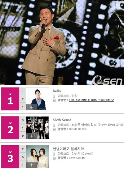 가수 허각이 미국 빌보드 K-팝 차트서 2주 연속 1위 자리를 지키는 영광을 안았다. 7일 빌보드 K-팝 최신 차트에 따르면 허각의 데뷔 미니앨범 타이틀곡 '헬로'가 수많은 걸그룹을 제치고 왕좌에 앉았다. '헬로'는 엠넷 '슈퍼스타K2'의 우승자인 허각이 '신인가수 허각'으로서 첫번째로 발매한 미니앨범 '퍼스트 스토리'의 타이틀 곡으로 애절한 허각의 음색이 돋보이는 정통 발라드 곡이다. 브라운아이드걸스의 '식스센스'가 2위, 다비치의 '안녕이라고 말하지마'가 3위에 올랐다. 한편 이번주 톱10에 새롭게 진입한 곡으로는 5위를 차지한 지아의 '내가 이렇지', 6위에 오른 인피니트의 '파라다이스', 8위 김건모의 '어제보다 슬픈 오늘'이 있다. goodhmh@osen.co.kr 미국 빌보드 차트 캡처.