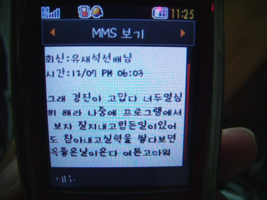 개그맨 김경진이 과거 유재석으로부터 받은 감동의 문자메시지를 공개해 눈길을 끌고 있다. 김경진은 7일 오전 자신의 트위터를 통해 "2007년 막내 개그맨 때, 코미디언실에 TV를 기증해주신 유재석 선배님께 저희 개그맨 동기 10명이 감사의 문자를 드렸어요, 놀랍게도 1인자 '유느님'이 얼굴도 모르는 막내들에게 한 명 한 명 답장을 준겁니다. 감동"이라는 글과 사진을 공개했다. 공개된 사진 속에는 '그래 경진아 고맙다. 너도 열심히 해라. 나중에 프로그램에서 보자. 잘 지내고 힘든 일이 있어도 참아내고 실력을 쌓다 보면 꼭 좋은 날이 온다. 하여튼 고마워'라는 유재석의 문자메시지가 담겨 있다. 이를 접한 네티즌은 "역시 유느님", "김경진도 언젠가 유재석처럼 될 듯", "정말 마음이 따뜻한 사람이다" 등의 반응을 보였다. 한편 김경진은 김구라-김태현이 진행하는 E채널 '포커 페이스'에 출연 중이다. pontan@osen.co.kr [사진] 김경진 트위터.