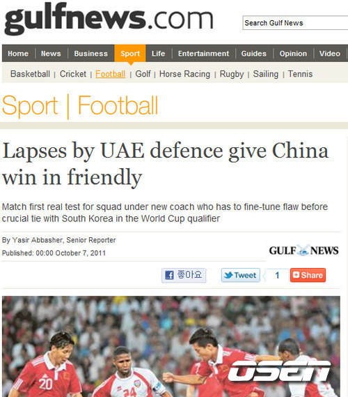 '수비가 문제'. 아랍에미리트연합(UAE)의 유력지 '걸프 뉴스'가 7일(이하 한국시간) 자국 대표팀의 경기력에 강한 실망감을 내비쳤다. UAE가 지난 6일 중국과 평가전에서 1-2로 패했기 때문이다. 경기 결과보다 내용이 더 실망스러웠다. 전반 5분과 16분 쑨샹과 가오린에게 익달아 득점을 내부면서 고전했다. 후반 41분 아이사 아흐메드가 만회골을 뽑아내 겨우 영패를 모면했다. 이에 대해 걸프 뉴스는 "UAE 수비수들이 15분동안 마치 낮잠을 잔 것 같다"는 표현으로 불만을 내비치며 오는 11일 한국과 2014 브라질 월드컵 아시아지역 3차 예선 3차전을 걱정했다. 물론, UAE는 정상적인 경기력을 발휘할 수 없는 사정이 있었다. 지난 9월 쿠웨이트 및 레바논과 3차 예선 1, 2차전 연패의 책임으로 카타네츠 전 감독이 경질됐기 때문이다. 중국전은 새롭게 지휘봉을 잡은 압둘라 마스파르 감독의 데뷔전이었다. 마스파르 감독은 중국전이 끝난 뒤 "선수들의 컨디션을 끌어 올리는데 무게를 둔 경기"라며 "한국전을 앞두고 젊은 선수들을 몇 명 불렀다. 좋은 결과가 있었으면 한다"고 말했다. stylelomo@osen.co.kr 걸프 뉴스 홈페이지 캡처.