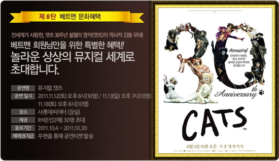 [스포츠토토] 국민체육진흥공단(www.kspo.or.kr)이 발행하는 체육진흥투표권 수탁사업자인 스포츠토토의 공식 온라인 발매 사이트 베트맨(www.betman.co.kr)이 오는 30일까지 뮤지컬 '캣츠'의 관람 기회를 제공하는 베트맨 문화혜택 제8탄 이벤트를 실시한다. 이번 이벤트는 스포츠토토 회원을 대상으로 진행되며, 벳볼 500개 이상을 보유한 회원은 누구나 응모가 가능하다. 베트맨은 이벤트에 응모한 회원 중 30명(1인 2매)을 추첨해 뮤지컬 '캣츠'의 관람권을 제공할 예정이다. 응모기간은 오는 30일까지며, 이벤트에 당첨된 회원들에게는 우편을 통해 뮤지컬 R석 예매권이 발송된다. 내달 12일, 13일, 18일 3일간 진행되는 공연에 각각 당첨된 회원 10명이 초대되며, 이벤트에 응모한 즉시 당첨 여부를 확인할 수 있다. 또 당첨자에게는 당첨자 발표시 입력된 개인정보(휴대폰, 유선전화 등)로 개별 연락이 취해진다. 한편 올해로 30주년을 맞은 '캣츠'는 잠실 샤롯데씨어터에서 9월부터 마법과 같은 환상적 무대가 펼쳐졌다. 이번 무대에는 인순이, 박해미, 홍지민이 캐스팅 되어 폭발적인 가창력과 화려한 무대를 선보이고 있다. 또 '캣츠'만의 매력적인 춤과 음악, 그리고 세계적인 기량의 캐스트들로 이번 무대를 관람하는 관객들에게 특별한 추억을 선사하고 있다. 스포츠토토 제공.