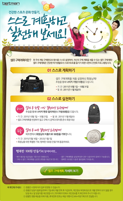 [스포츠토토] 국민체육진흥공단(www.kspo.or.kr)이 발행하는 체육진흥투표권 수탁사업자인 스포츠토토의 공식 온라인 발매 사이트 베트맨(www.betman.co.kr)이 건전한 여가생활로서 스포츠토토를 즐기기 위한 프로그램인 '셀프구매계획' 이벤트를 오는 31일까지 진행한다. 셀프구매계획이란 과도한 게임 몰입으로 인한 부작용을 예방하기 위해 베트맨 가입회원이 스스로 한 주 동안 얼마나 구매할 지 구매금액 한도와 횟수를 미리 설정하고 실천하는 것을 뜻한다. 이번 이벤트는 보다 많은 회원이 셀프구매계획을 통해 회원들의 건전하고 즐거운 게임참여를 유도하고자 마련된 것이다. 이번 이벤트에서 처음으로 셀프구매계획을 설정하는 회원들 가운데 15명을 추첨해 나이키 가방을 증정할 예정이다. 베트맨은 또 셀프구매계획을 설정한 회원이 매주 월요일부터 일요일까지 자신이 설정한 구매한도를 잘 준수할 경우 회원의 이름으로 매주 100원씩 기부금을 적립해주는 '행복한 100원 만들기' 이벤트도 함께 진행한다. 이렇게 적립된 기부금은 베트맨이 사회복지공동모금회와 함께 진행하고 있는 '희망더하기사랑나누기' 캠페인을 통해 우리 사회의 어려운 이웃들의 잃어버린 희망을 되찾아주는데 사용된다. 또 셀프구매계획 설정 후 한달 간 이를 잘 준수한 회원들에게는 추첨을 통해 나이키 맨유 얼리어전스 가방(10명)을 증정한다. 이번 이벤트는 오는 31일까지 참여할 수 있으며 당첨자는 내달 9일에 발표한다. 스포츠토토 제공.