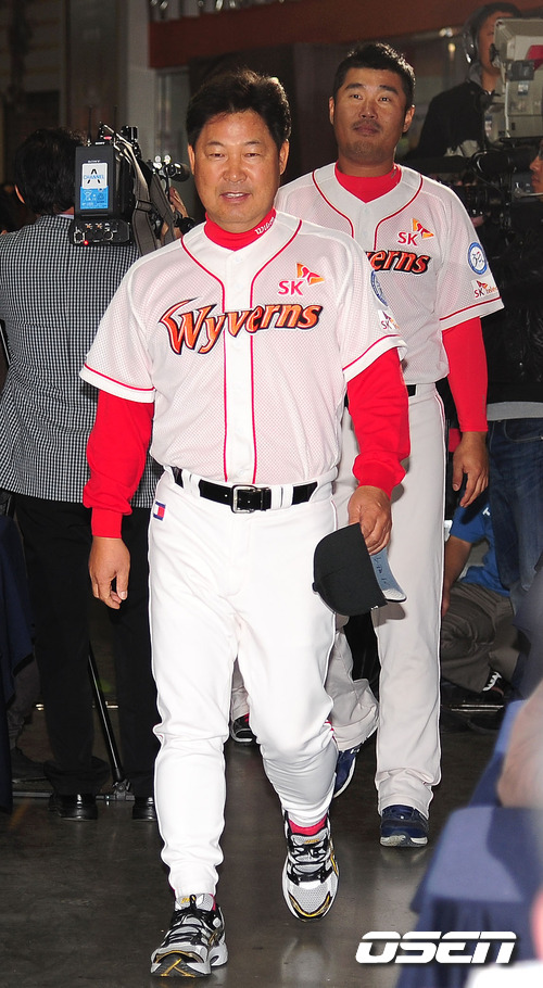 '2011 롯데카드 프로야구' SK 와이번스와 KIA 타이거즈의 준플레이오프 미디어데이가 7일 문학야구장에서 열렸다. SK 이만수 감독과 이호준이 기자회견장에 들어서고 있다. SK 와이번스는 이만수 감독, 이호준 정근우 KIA 타이거즈는 조범현 감독 이종범 서재응이 참석했다. SK는 시즌 종반 김성근 전 감독의 사퇴로 내홍을 앓았고, KIA는 시즌 중반 1위에서 4위로 떨어지는 심각한 성적 하락을 겪었다. /spjj@osen.co.kr