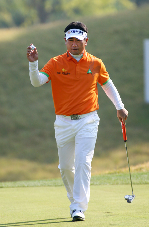 '바람의 아들' 양용은(KB금융그룹)이 코오롱 제54회 한국오픈 골프선수권대회 이틀째에도 공동 선두를 지켰다. 대회 세 번째 우승을 노리는 양용은은 7일 천안 우정힐스 골프장(파71·7천225야드)에서 열린 2라운드에서 버디 3개에 보기 2개를 곁들여 1언더파 70타를 기록했다. 중간합계 5언더파 137타인 양용은은 현재 로리 매킬로이(북아일랜드), 모중경(현대스위스금융그룹), 리키 파울러(미국)와 선두 그룹을 형성했다. 오전 7시35분 10번홀에서 경기를 시작한 양용은 쌀쌀한 날씨 때문에 몸이 풀리지 않은 듯 짧은 퍼트를 넣지 못해 타수를 많이 줄이지 못했다. 12번홀(파4)에서 1타를 줄인 양용은은 13번홀(파3)에서 티샷을 홀 1.2m에 붙이고도 버디 퍼트를 넣지 못했고 17번홀(파4)에서는 1.2m짜리 파 퍼트를 놓쳐 1타를 잃기도 했다. 이틀째 양용은과 동반 플레이를 펼친 매킬로이는 2라운드에서 2타를 줄여 양용은과 어깨를 나란히 했다. 양용은은 "오전에 날씨가 쌀쌀해 비거리도 많이 나지 않았다"며 "오후에는 날씨가 풀려 좋았는데 타수를 더 줄이지 못한 것이 아쉽다"고 말했다. 10bird@osen.co.kr 코오롱 한국오픈 조직위 제공.
