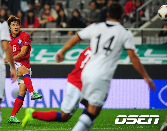 홍명보 감독이 이끄는 올림픽 축구대표팀이 7일 오후 서울월드컵경기장에서 우즈베키스탄과의 친선 경기를 가졌다. 전반 한국 박종우가 프리킥으로 팀 세번째 골을 성공시키고 있다. 한국과 마찬가지로 올림픽 아시아 최종 예선 1차전서 승리를 거둔 우즈베키스탄은 국가대표로 발탁된 1명을 제외한 정예 선수들이 출전한다. 국가대표팀에 중복 차출돼 선수들의 공백이 생기면서 이번 올림픽 대표팀에는 20세 이하(U-20) 콜롬비아 월드컵서 활약했던 선수들이 그 자리를 대신했다. 기존의 장현수, 백성동 이외에 황도연, 김영욱, 김경중이 새롭게 이름을 올렸다. 홍명보호는 내달 23일과 27일 카타르, 사우디아라비아와의 최종예선 2,3차전을 앞두고 이번 우즈베키스탄과의 친선 경기를 통해 변수에 대한 적응력을 키울 계획이다. 이 날 A대표팀과 올림픽대표팀이 최초로 같은 날, 같은 장소에서 릴레이 매치를 벌인다. / rumi@osen.co.kr