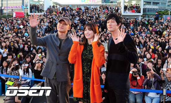 7일 오후 부산 해운대 피프빌리지에서 열린 부산 국제영화제 개막작 영화 '오직 그대만' 야외 무대인사에서 배우 소지섭과 한효주, 송일곤 감독이 포즈를 취하고 있다. 영화 '오직 그대만'은 전직 복서 '철민'(소지섭 분)과 사고로 시력을 잃어가는 '정화'(한효주 분)가 만나 운명을 건 사랑을 시작하는 이야기로 송일곤 감독이 메가폰을 잡은 작품이다. 한편 아시아 최대 영화제로 떠오른 부산국제영화제는 지난 6일 부산 영화의전당 야외극장에서 화려한 개막식을 시작으로 9일 간의 대장정을 돌입했다./ soul1014@osen.co.kr.