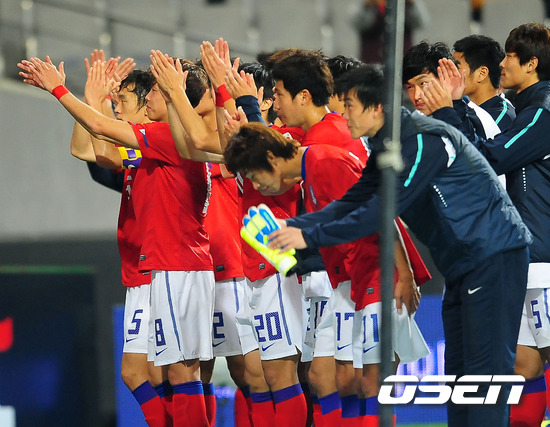 홍명보 감독이 이끄는 올림픽 축구대표팀이 7일 오후 서울월드컵경기장에서 우즈베키스탄과의 친선 경기에서 홍명보호는 1골 1도움을 기록한 김태환, 박용지, 윤일록의 활약에 힘입어 5-1 대승을 거뒀다. 경기를 마치고 한국 올림픽 대표팀 선수들이 팬들에게 인사를 하고 있다. 이로써 올림픽 대표팀은 최근 4경기서 3승 1무를 기록하며 다가오는 2012년 런던 올림픽 최종 예선의 전망을 밝게 했다. 올림픽 대표팀은 다음달 23일 카타르(원정), 27일 사우디아라비아(홈)와 올림픽 최종 예선 경기를 갖는다. / rumi@osen.co.kr