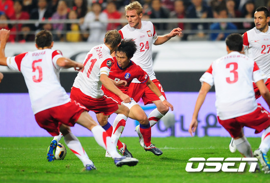 조광래 감독이 이끄는 월드컵 축구대표팀이 7일 오후 서울월드컵경기장에서 폴란드와의 친선 경기를 가졌다. 전반 윤빛가람이 돌파를 시도하고 있다. 조광래 감독은 이번 소집 명단에서 다시 한 번 변화를 꾀했다. 논란 속에서 이동국을 추가발탁하고 서정진 이승기 이현승 등을 새롭게 발굴한 것. 여기에 곽태휘와 조병국을 발탁해 수비의 안정을 꾀했다. 잦은 부상으로 대표팀과 인연이 멀어졌던 손흥민의 복귀도 눈에 띈다. 발목을 다쳐 지난 3차 예선 1~2차전에 합류하지 못했던 손흥민은 최근 부상에서 회복하며 다시 조광래 감독의 부름을 받았다. 한편 성남 복귀전에서 부상을 당한 김정우는 제외됐다. 전날 열린 기자회견에서 조광래 감독은 원톱 공격수로 이동국을 좌우 측면에 지동원(선덜랜드)와 박주영(아스날)을 기용하겠다고 말했다. 이들의 포지션 변화도 고무적이다. 최전방에서 활약하며 움직임을 보였던 선수들에게 새로운 기회를 주겠다는 의미다. 조광래호는 오는 11일 월드컵 아시아지역 3차예선 아랍에미리트연합(UAE)과의 경기를 앞두고 최고참 이동국의 존재는 대표팀의 분위기를 바꿀 수 있을지 귀추가 주목된다. / rumi@osen.co.kr