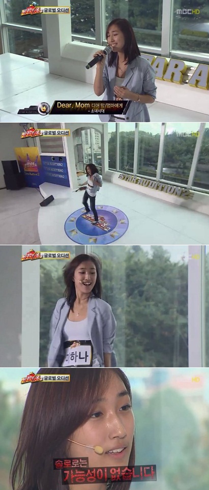MBC '위대한 탄생2(이하 위탄2)'의 참가자 이하나(20)가 완벽한 노래와 안무로 결선에 진출했다. 7일 오후 방송된 '위탄2'에서는 글로벌 오디션 장면이 전파를 탔다. 미국 버지니아주에서 온 이하나는 사전 인터뷰에서 "3개월 전에 췌장암으로 돌아가셨다. 믿고 싶지 않았고, 갑작스러웠다"고 특별한 사연을 밝혔다. 이어진 오디션 무대에서 이하나는 소녀시대의 '디어 맘'을 자신의 감정을 이입시켜 애절한 목소리로 선보였고, 포미닛 '허'에 맞춰 안무를 완벽히 재현해냈다. 무대를 접한 심사위원 윤일상은 "목소리가 예쁜데 일반적이다. 끼가 없지 않은데 일반적이다"고 혹평을 남기며 탈락을 줬지만, 휘성은 "그룹에서 특색있는 음색에 기대를 하겠다", 이승환은 "호흡이 거친데 그런 것들은 고칠 수 있다"고 평가하며 합격을 줬다. 무대를 마친 이하나는 "실감이 안 난다" 밝은 미소를 지었고, 하늘에 있는 어머니에게 "감사하다"고 소감을 전했다. pontan@osen.co.kr ☞ hoppin 동영상 바로보기 [사진] '위대한 탄생2' 방송 캡처.