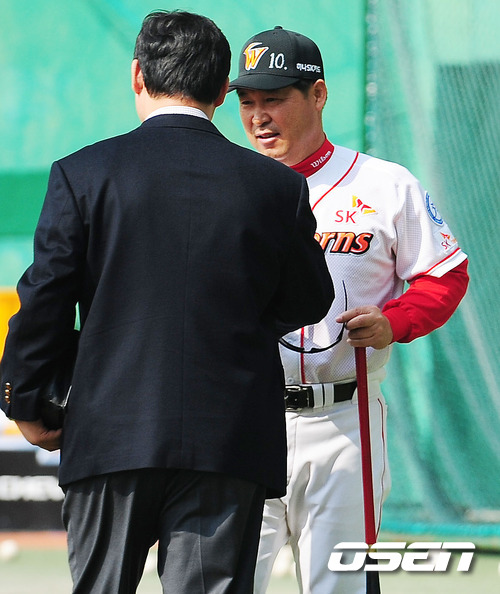 '2011 롯데카드 프로야구' SK 와이번스와 KIA 타이거즈의 준플레이오프 1차전이 8일 문학야구장에서 열릴 예정인 가운데 양팀이 훈련시간을 가졌다. SK 이만수 감독 대행이 선수들의 그라운드로 나와 선수들의 훈련을 지켜볼때 허구연 해설위원을 만나 악수를 나누고 있다. 한국의 좌,우를 대표하는 두 에이스인 김광현(23·SK)과 윤석민(25·KIA)이 준플레이오프 1차전부터 격돌한다. 두 선수가 포스트시즌에서 맞붙는 것은 이번이 처음. SK는 시즌 종반 김성근 전 감독의 사퇴로 내홍을 앓았고, KIA는 시즌 중반 1위에서 4위로 떨어지는 심각한 성적 하락을 겪었다. 한편 프로야구 준플레이오프 5전 3선승제로 진행된다. 8~9일 인천 문학구장에서 2연전이 열리고 하루를 쉰 뒤 11~12일 광주구장에서 3, 4차전이 이어진다. 4차전까지 승부를 가리지 못하면 14일 문학구장으로 돌아와 최종전을 벌인다. / rumi@osen.co.kr