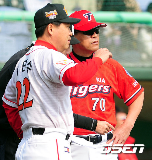 '2011 롯데카드 프로야구' SK 와이번스와 KIA 타이거즈의 준플레이오프 1차전이 8일 문학야구장에서 열렸다. 경기 전 양팀 감독이 주심으로 부터 주의사항을 듣고 있다. 준플레이오프 1차전은 한국의 좌,우를 대표하는 두 에이스인 김광현(23·SK)과 윤석민(25·KIA)이 선발로 나와 빅매치를 벌인다. 두 선수는 포스트시즌에서는 처음으로 맞대결을 벌인다. SK는 시즌 종반 김성근 전 감독의 사퇴로 내홍을 앓았고, KIA는 시즌 중반 1위에서 4위로 떨어지는 심각한 성적 하락을 겪었다. 프로야구 준플레이오프는 5전 3선승제로 진행, 8~9일 인천 문학구장에서 2연전이 열리고 하루를 쉰 뒤 11~12일 광주구장에서 3, 4차전이 이어진다. 4차전까지 승부를 가리지 못하면 14일 문학구장으로 돌아와 최종전을 벌인다. / spjj@osen.co.kr