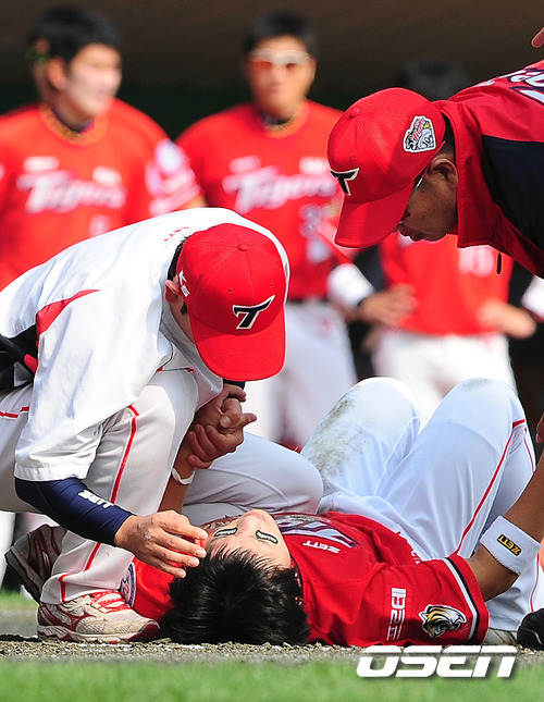 '2011 롯데카드 프로야구' SK 와이번스와 KIA 타이거즈의 준플레이오프 1차전이 8일 문학야구장에서 열렸다. 1회초 1사 1루 이범호의 좌전안타때 홈으로 파고들던 김선빈이 SK 정상호 포수와 충돌 하고 있다. 김선빈은 아웃. 준플레이오프 1차전은 한국의 좌,우를 대표하는 두 에이스인 김광현(23·SK)과 윤석민(25·KIA)이 선발로 나와 빅매치를 벌인다. 두 선수는 포스트시즌에서는 처음으로 맞대결을 벌인다. SK는 시즌 종반 김성근 전 감독의 사퇴로 내홍을 앓았고, KIA는 시즌 중반 1위에서 4위로 떨어지는 심각한 성적 하락을 겪었다. 프로야구 준플레이오프는 5전 3선승제로 진행, 8~9일 인천 문학구장에서 2연전이 열리고 하루를 쉰 뒤 11~12일 광주구장에서 3, 4차전이 이어진다. 4차전까지 승부를 가리지 못하면 14일 문학구장으로 돌아와 최종전을 벌인다. / spjj@osen.co.kr