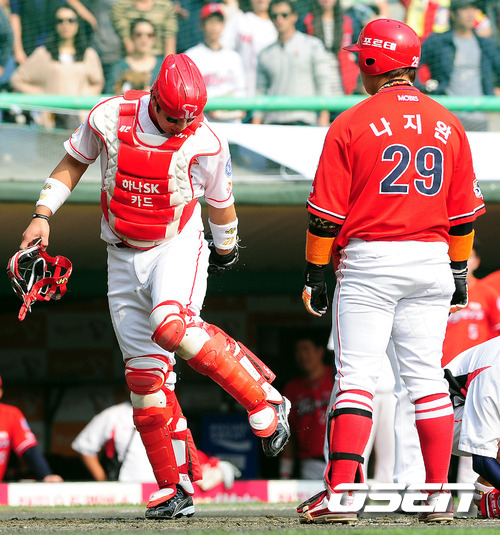 '2011 롯데카드 프로야구' SK 와이번스와 KIA 타이거즈의 준플레이오프 1차전이 8일 문학야구장에서 열렸다. 1회초 1사 1루 이범호의 좌전안타때 홈으로 파고들던 김선빈이 SK 정상호 포수와 충돌 부상을 당하자 나지완이 정상호 포수를 바라보고 있다. 김선빈은 아웃. 준플레이오프 1차전은 한국의 좌,우를 대표하는 두 에이스인 김광현(23·SK)과 윤석민(25·KIA)이 선발로 나와 빅매치를 벌인다. 두 선수는 포스트시즌에서는 처음으로 맞대결을 벌인다. SK는 시즌 종반 김성근 전 감독의 사퇴로 내홍을 앓았고, KIA는 시즌 중반 1위에서 4위로 떨어지는 심각한 성적 하락을 겪었다. 프로야구 준플레이오프는 5전 3선승제로 진행, 8~9일 인천 문학구장에서 2연전이 열리고 하루를 쉰 뒤 11~12일 광주구장에서 3, 4차전이 이어진다. 4차전까지 승부를 가리지 못하면 14일 문학구장으로 돌아와 최종전을 벌인다. / spjj@osen.co.kr
