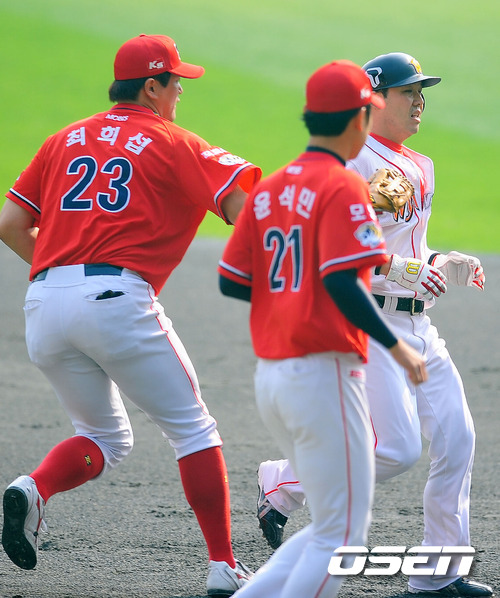 '2011 롯데카드 프로야구' SK 와이번스와 KIA 타이거즈의 준플레이오프 1차전이 8일 오후 문학야구장에서 열렸다. 2회말 2사 주자 1루 SK 김강민 타석에서 1루 주자 박진만이 도루를 시도했으나 여의치 않자 귀루, KIA 1루수 최희섭에게 태그아웃을 당하고 있다. 한국의 좌,우를 대표하는 두 에이스인 김광현(23·SK)과 윤석민(25·KIA)이 준플레이오프 1차전부터 격돌한다. 두 선수가 포스트시즌에서 맞붙는 것은 이번이 처음. SK는 시즌 종반 김성근 전 감독의 사퇴로 내홍을 앓았고, KIA는 시즌 중반 1위에서 4위로 떨어지는 심각한 성적 하락을 겪었다. 한편 프로야구 준플레이오프 5전 3선승제로 진행된다. 8~9일 인천 문학구장에서 2연전이 열리고 하루를 쉰 뒤 11~12일 광주구장에서 3, 4차전이 이어진다. 4차전까지 승부를 가리지 못하면 14일 문학구장으로 돌아와 최종전을 벌인다. / rumi@osen.co.kr