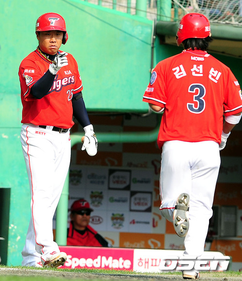 '2011 롯데카드 프로야구' SK 와이번스와 KIA 타이거즈의 준플레이오프 1차전이 8일 문학야구장에서 열렸다. 3회초 1사 2,3루서 희생플라이로 타점을 올린 김선빈을 이범호가 반갑게 맞이하고 있다. 준플레이오프 1차전은 한국의 좌,우를 대표하는 두 에이스인 김광현(23·SK)과 윤석민(25·KIA)이 선발로 나와 빅매치를 벌인다. 두 선수는 포스트시즌에서는 처음으로 맞대결을 벌인다. SK는 시즌 종반 김성근 전 감독의 사퇴로 내홍을 앓았고, KIA는 시즌 중반 1위에서 4위로 떨어지는 심각한 성적 하락을 겪었다. 프로야구 준플레이오프는 5전 3선승제로 진행, 8~9일 인천 문학구장에서 2연전이 열리고 하루를 쉰 뒤 11~12일 광주구장에서 3, 4차전이 이어진다. 4차전까지 승부를 가리지 못하면 14일 문학구장으로 돌아와 최종전을 벌인다. / spjj@osen.co.kr