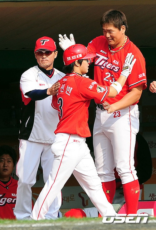 '2011 롯데카드 프로야구' SK 와이번스와 KIA 타이거즈의 준플레이오프 1차전이 8일 문학야구장에서 열렸다. 3회초 1사 2,3루서 희생플라이로 타점을 올린 김선빈을 최희섭이 반갑게 맞이하고 있다. 준플레이오프 1차전은 한국의 좌,우를 대표하는 두 에이스인 김광현(23·SK)과 윤석민(25·KIA)이 선발로 나와 빅매치를 벌인다. 두 선수는 포스트시즌에서는 처음으로 맞대결을 벌인다. SK는 시즌 종반 김성근 전 감독의 사퇴로 내홍을 앓았고, KIA는 시즌 중반 1위에서 4위로 떨어지는 심각한 성적 하락을 겪었다. 프로야구 준플레이오프는 5전 3선승제로 진행, 8~9일 인천 문학구장에서 2연전이 열리고 하루를 쉰 뒤 11~12일 광주구장에서 3, 4차전이 이어진다. 4차전까지 승부를 가리지 못하면 14일 문학구장으로 돌아와 최종전을 벌인다. / spjj@osen.co.kr