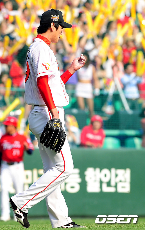 '2011 롯데카드 프로야구' SK 와이번스와 KIA 타이거즈의 준플레이오프 1차전이 8일 문학야구장에서 열렸다. 4회초 KIA 선두타자 김상현에게 안타를 맞은 김광현이 손가락을 바라보고 있다. 준플레이오프 1차전은 한국의 좌,우를 대표하는 두 에이스인 김광현(23·SK)과 윤석민(25·KIA)이 선발로 나와 빅매치를 벌인다. 두 선수는 포스트시즌에서는 처음으로 맞대결을 벌인다. SK는 시즌 종반 김성근 전 감독의 사퇴로 내홍을 앓았고, KIA는 시즌 중반 1위에서 4위로 떨어지는 심각한 성적 하락을 겪었다. 프로야구 준플레이오프는 5전 3선승제로 진행, 8~9일 인천 문학구장에서 2연전이 열리고 하루를 쉰 뒤 11~12일 광주구장에서 3, 4차전이 이어진다. 4차전까지 승부를 가리지 못하면 14일 문학구장으로 돌아와 최종전을 벌인다. / spjj@osen.co.kr