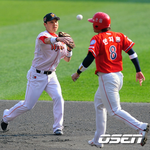 '2011 롯데카드 프로야구' SK 와이번스와 KIA 타이거즈의 준플레이오프 1차전이 8일 오후 문학야구장에서 열렸다. 4회초 무사 주자 1,2루 KIA 최희섭의 2루수 병살타때 SK 유격수 박진만이 2루에서 안치홍을 포스아웃 시킨 후 1루로 송구하고 있다. 한국의 좌,우를 대표하는 두 에이스인 김광현(23·SK)과 윤석민(25·KIA)이 준플레이오프 1차전부터 격돌한다. 두 선수가 포스트시즌에서 맞붙는 것은 이번이 처음. SK는 시즌 종반 김성근 전 감독의 사퇴로 내홍을 앓았고, KIA는 시즌 중반 1위에서 4위로 떨어지는 심각한 성적 하락을 겪었다. 한편 프로야구 준플레이오프 5전 3선승제로 진행된다. 8~9일 인천 문학구장에서 2연전이 열리고 하루를 쉰 뒤 11~12일 광주구장에서 3, 4차전이 이어진다. 4차전까지 승부를 가리지 못하면 14일 문학구장으로 돌아와 최종전을 벌인다. / rumi@osen.co.kr
