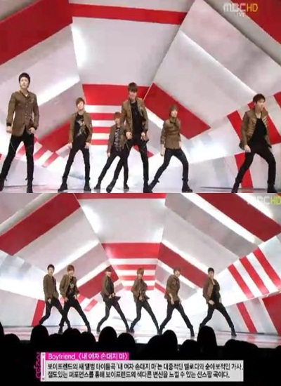 그룹 보이프렌드가 소년에서 남자로 변신했다. 8일 방송된 MBC '쇼!음악중심'에 출연한 보이프렌드는 신곡 '내 여자 손대지마' 무대로 남성적 매력을 과시했다. 이들은 갈색 재킷을 입고 귀여운 표정 대신 카리스마 있는 표정으로 관객을 압도했다. 이들이 선보인 '내 여자 손대지마'는 순애보적인 가사와 절도있는 안무가 포인트인 곡이다. 보이프렌드가 등장하자 관객들은 크게 함성을 지르며 열광했다. 한편 이날 '쇼!음악중심'에는 슈퍼주니어, 카라, 브라운 아이드 걸스, 김규종, 인피니트, 유키스, 김장훈, B1A4, 하하, 다비치, 간미연, 메이비, 보이프렌드, Simon D, 쥬얼리S, 살찐 고양이, 알리, 쇼콜라, 피기돌스 등이 출연해 화려한 무대를 꾸몄다. goodhmh@osen.co.kr ☞ hoppin 동영상 바로보기 '쇼!음악중심' 화면 캡처.