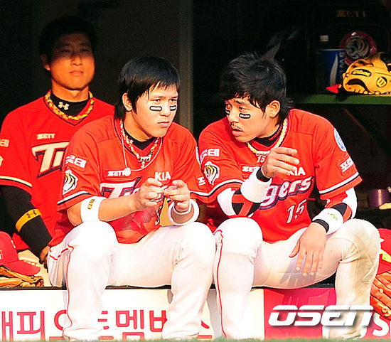 '2011 롯데카드 프로야구' SK 와이번스와 KIA 타이거즈의 준플레이오프 1차전이 8일 문학야구장에서 열렸다. 9회초 KIA 공격때 이용규와 김선빈이 이야기를 나누고 있다. 1차전은 한국의 좌,우를 대표하는 두 에이스인 김광현(23·SK)과 윤석민(25·KIA)이 선발로 나와 빅매치를 벌인다. 두 선수는 포스트시즌에서는 처음으로 맞대결을 벌였다. SK는 시즌 종반 김성근 전 감독의 사퇴로 내홍을 앓았고, KIA는 시즌 중반 1위에서 4위로 떨어지는 심각한 성적 하락을 겪었다. 프로야구 준플레이오프는 5전 3선승제로 진행, 8~9일 인천 문학구장에서 2연전이 열리고 하루를 쉰 뒤 11~12일 광주구장에서 3, 4차전이 이어진다. 4차전까지 승부를 가리지 못하면 14일 문학구장으로 돌아와 최종전을 벌인다. / spjj@osen.co.kr