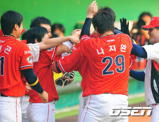 '2011 롯데카드 프로야구' SK 와이번스와 KIA 타이거즈의 준플레이오프 1차전이 8일 문학야구장에서 열렸다. 9회초 2사 주자 만루 KIA 차일목이 좌월 만루 홈런을 날린 후 덕아웃에서 동료들의 거친 축하를 받고 있다. 한국의 좌,우를 대표하는 두 에이스인 김광현(23·SK)과 윤석민(25·KIA)이 준플레이오프 1차전부터 격돌한다. 두 선수가 포스트시즌에서 맞붙는 것은 이번이 처음. SK는 시즌 종반 김성근 전 감독의 사퇴로 내홍을 앓았고, KIA는 시즌 중반 1위에서 4위로 떨어지는 심각한 성적 하락을 겪었다. 한편 프로야구 준플레이오프 5전 3선승제로 진행된다. 8~9일 인천 문학구장에서 2연전이 열리고 하루를 쉰 뒤 11~12일 광주구장에서 3, 4차전이 이어진다. 4차전까지 승부를 가리지 못하면 14일 문학구장으로 돌아와 최종전을 벌인다. / rumi@osen.co.kr